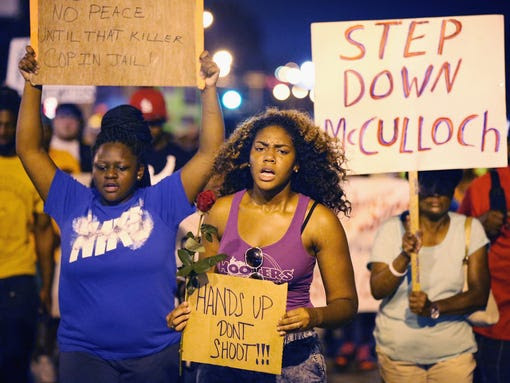 FERGUSON, MO - AUGUST 21: Demonstrators protest the death of Michael Brown on August 21, 2014 in Ferguson, Missouri. Brown was shot and killed by a Ferguson police officer on August 9. Despite the Brown family's continued call for peaceful demonstrations, violent protests have erupted nearly every night in Ferguson since his death.(Photo: Scott Olson Getty Images)